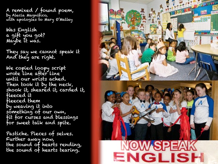 So, in this digital draft, I highlighted the political aspects of the Shape of Saying and the ways in which this struggle for (and with) language plays out in classrooms. In creating a found poem, I thought about the broader, more universal meanings in the poem and highlighted them. (For instance, “Received English” is not a currently typical term of art.) I used Creative Commons photographs to get my readers thinking about diverse classrooms, as well as a Wikimedia commons image of one of the increasingly, sadly, common “Welcome to America, now speak English” signs. I wrote in a chalkboard font to connect strongly to classroom language, and made the dividing line to separate the images from the words in red, to signify pain and separation, as “the sound of hearts tearing” does in the original. A tearing heart bleeds, whether white, black, Irish, Mexican, or any other specific identity.